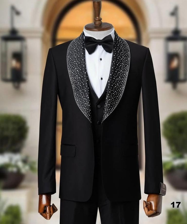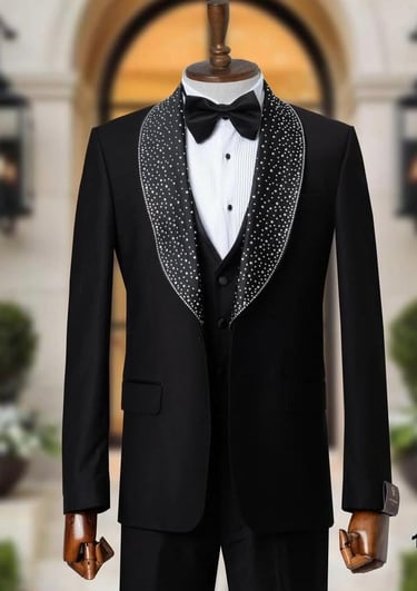 A stylish male model wearing a sleek black tailored suit, posing confidently against a dark, elegant background.